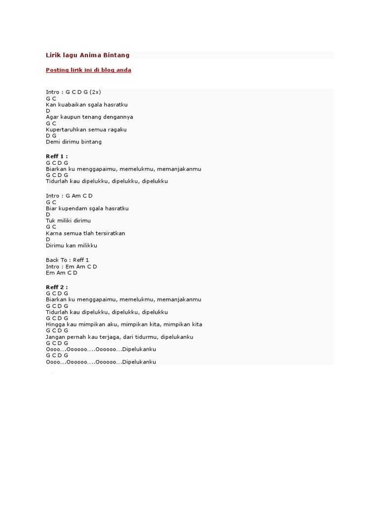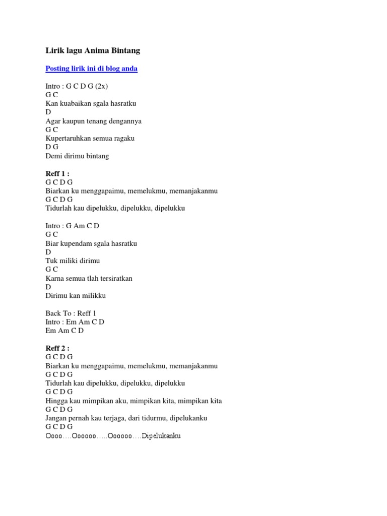 Anime bintang lirik. C f g c. Lirik bintang oleh anima. Reff 1 reff 2. Lagu ini juga dinyanyikan kembali oleh tina toon pada 2013.